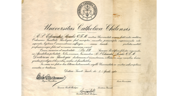 Seis años después de este hito, en 1941, se otorgó el primer grado de doctor en la UC, al franciscano Eduardo Rosales Rojas.