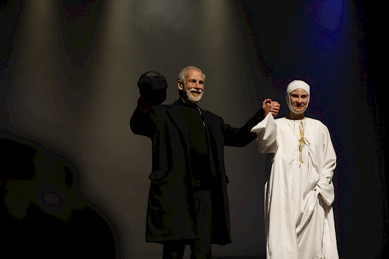 Ese día de 1985 en campus Oriente, al inicio de la lectura dramatizada, Julieta Melo cruzaba el aula con un vestido negro, con flecos que se movían entre sus pasos lentos, junto a sus medias oscuras, y con el pelo en un moño, mientras Noguera releía “El Führer. Carta abierta a Rudolf Hess, prisionero de Spandau”. Allí, el actor lanzaba frases como “un buenmozo ario de excepción, quiero decir moreno, pero de raza heroica” y “¿Quién fue realmente el Führer? ¿Por qué hasta el fin invocó el nombre del altísimo?”. En la sala colgaba una bandera grande con la imagen de una esvástica sujetada por alfileres. Julieta caminaba por la sala, sombría, hasta esconderse tras esa bandera, para reaparecer después frente al público con otro semblante, otra ropa, otro mensaje: vestida con una túnica blanca, de lino, cara lavada y con el pelo suelto, ella deshacía la esvástica, para luego reaco- modar los alfileres en la bandera hasta dar lugar a una Estrella de David.
