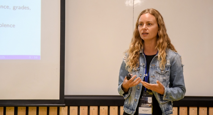 Josefa Aguirre, académica del Instituto de Economía UC, presentó su investigación sobre el impacto de la violencia escolar en las trayectorias de vida. De acuerdo a la experta, las víctimas de maltrato experimentan un efecto de “cicatrización”: aunque la exposición a la violencia cese, las desventajas educativas persisten durante años.