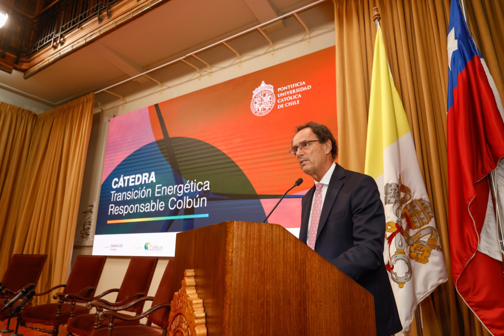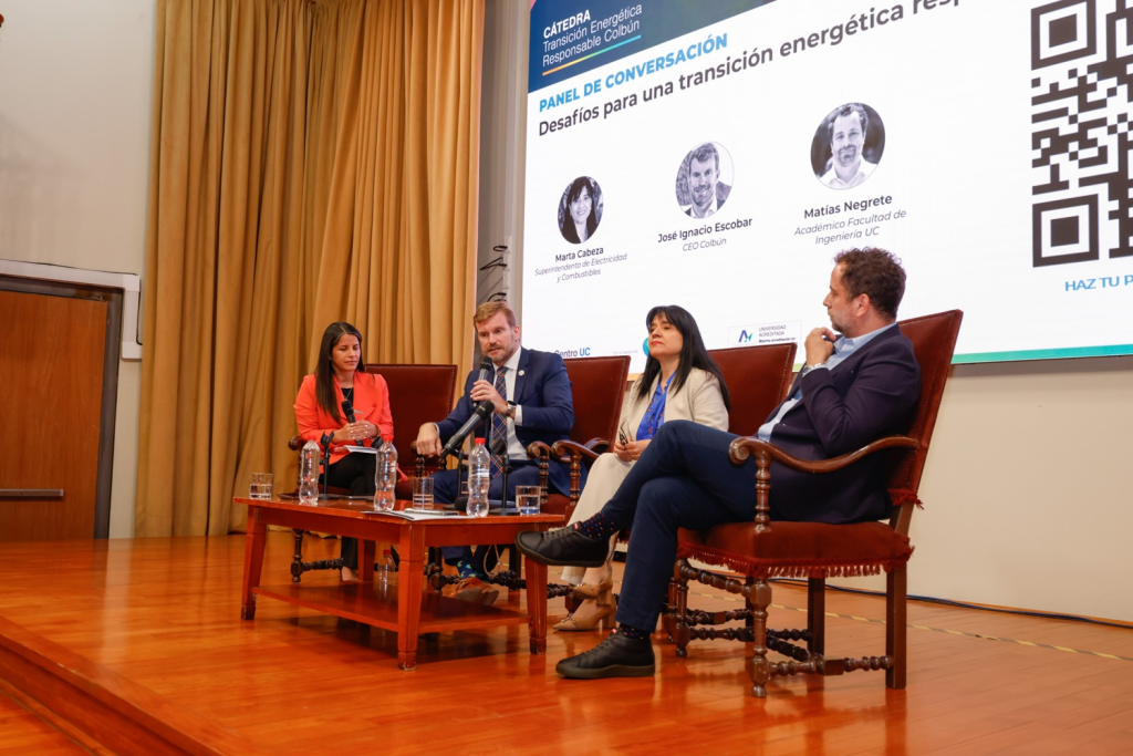 El encuentro contó con la participación del rector de la UC Juan Carlos de la Llera; José Ignacio Escobar, CEO de Colbún; Marta Cabeza, superintendenta de Electricidad y Combustibles; Paulina Basoalto, Gerente de Regulación de Colbún, y Matías Negrete, académico de la Escuela de Ingeniería UC.