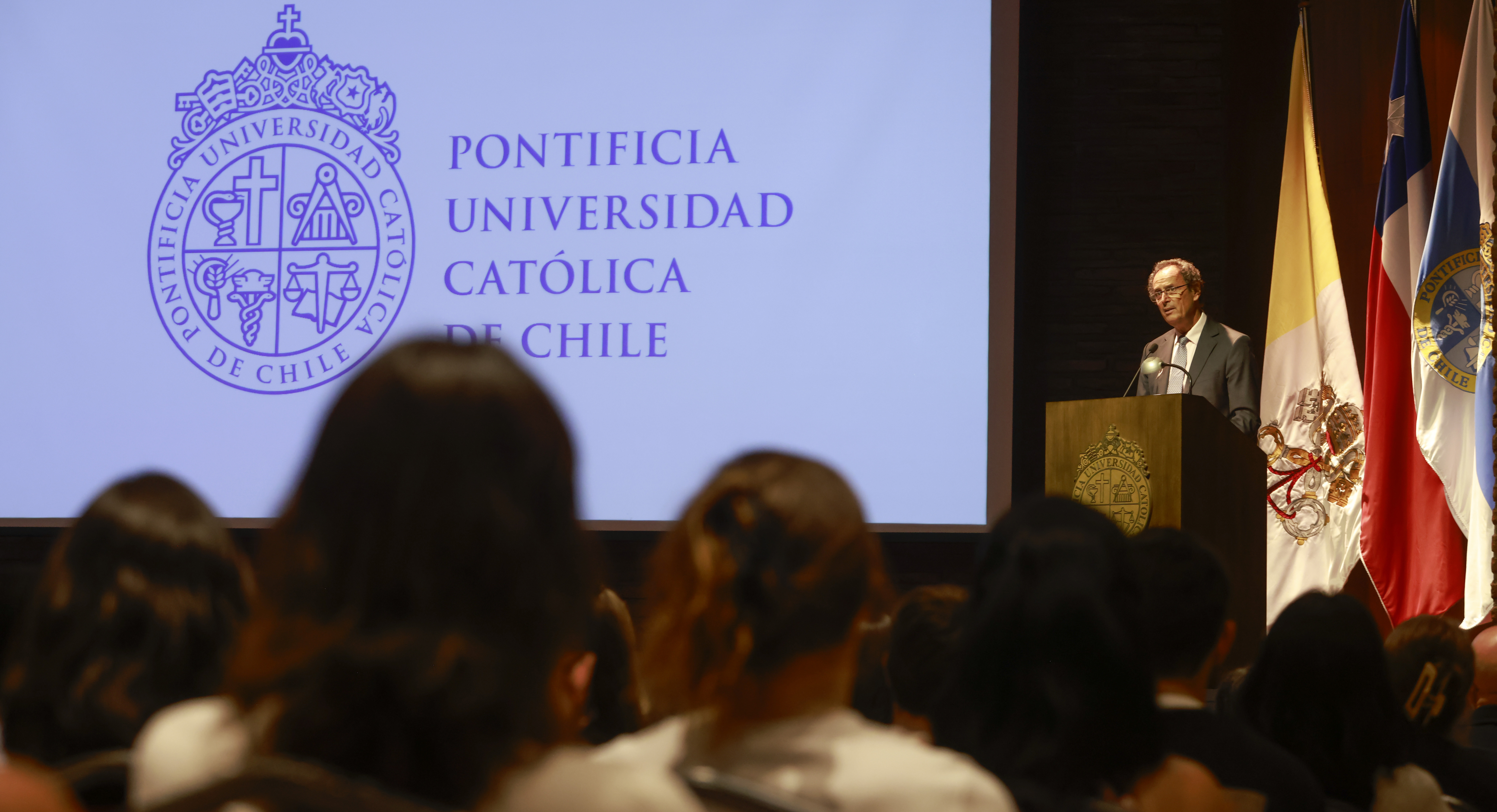 La ceremonia fue encabezada por el rector Juan Carlos de la Llera, quien les dio la bienvenida, agradeció la confianza que han puesto en la universidad y los instó a aprovechar su tiempo en la UC. “No se queden solo en la sala de clases. Conversen con sus profesores. Participen en proyectos. Conozcan a estudiantes chilenos. Únanse a actividades culturales, deportivas y sociales”, señaló.