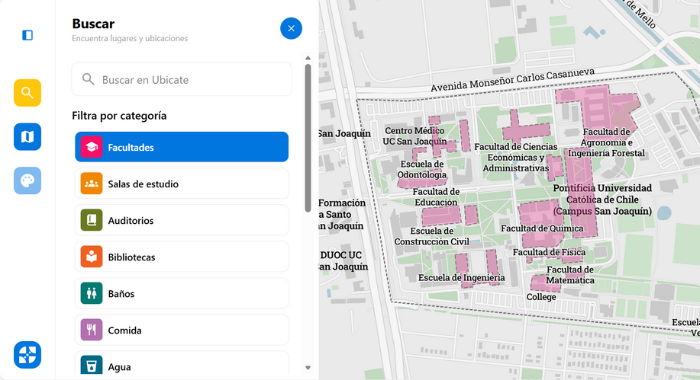 La herramienta digital busca facilitar la orientación en todos los campus de la UC. Posee una navegación sencilla que permite filtrar información por categorías como facultades, salas de clases, estacionamientos, entre otras.